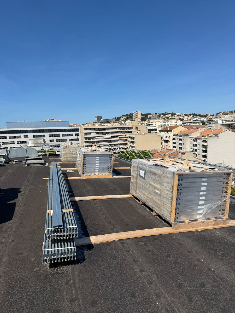 Réfection complète de l’étanchéité sur toiture en bac acier, incluant des découpes précises du bac pour permettre l’implantation des pieds des panneaux solaires. Cette intervention assure à la fois l’étanchéité durable de la toiture et la préparation optimale pour l’installation des systèmes photovoltaïques.